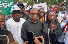 Former Labour Party presidential candidate, Peter Obi, on Monday joined hundreds of protesters who converged on the National Assembly Complex, Abuja, to oppose the Senate’s decision to water down provisions on the electronic transmission of election results in the Electoral Act Amendment Bill.